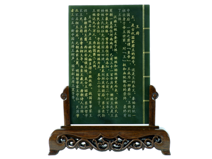 富裕了的每位国人和世界异邦的华侨,其成功的背后,都可寻找到其姓氏家族的人文信息和辉煌史,所以百家姓台屏满足了每位成功人士的认祖感恩情结,而收藏在家又能成为祭祖和教育后代的传世文物。百家姓碧玉台屏正面为每一姓氏的始祖像,背面为每个姓氏是如何产生,延续至今的历史简介,以及每个姓氏在历史上的著名人士和成功人士,同时也可将收藏者和您要赠送的客人名字刻上。
