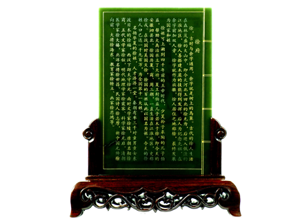 为确保插屏的工艺质量,每片19cm×13cm×0.4cm的碧玉,却要耗费3公斤毛料,才能做到每片碧玉温润油腻,晶莹透晰,填上金粉后,插在红木屏架上,显得典雅富丽,古朴精致,是祭祖、弘扬家史,延续门风等不可不珍藏的珍贵文物和赠送客人的最佳礼品。