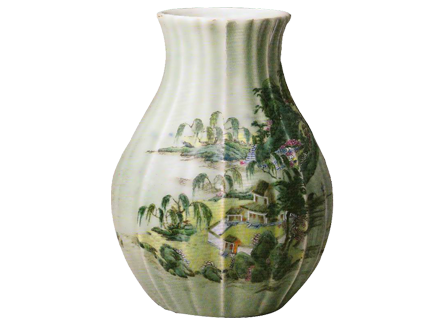 瓶呈瓜棱形,敞口,束颈,鼓腹,圈足。通体施东青釉。外壁粉彩绘山村渔舟图。底施东青釉并书方形金字篆书款。