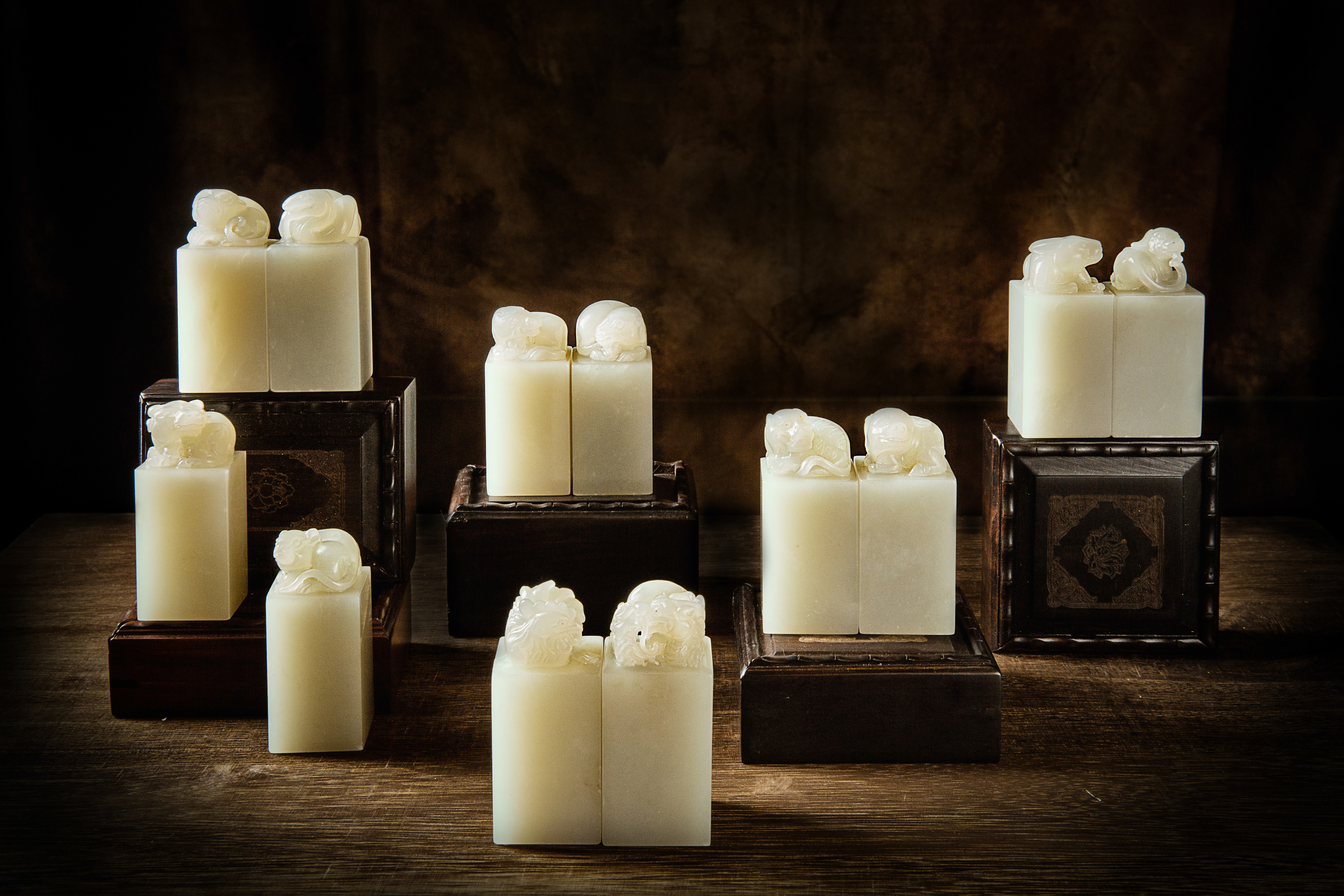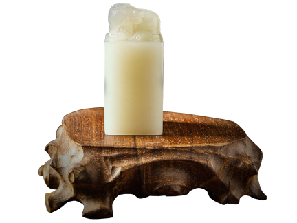 为助国风,鸿运斋开发创意的十二生肖全套印章,使用上等和田山料白玉,玉质温润细腻,似上等寿山石中的栗子冻,但礼法规格又高于寿山石。为彰显此套印章的精英血统,印纽与印章的设计与雕刻,均由上海工艺美术大师韩荣昌亲自操刀,十二种动物栩栩如生,深得盛唐气象之神韵。