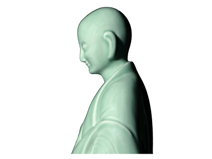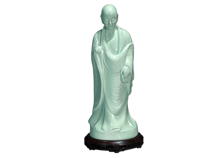 鸿运斋与中国瓷雕第一人,中国工艺美术大师(原中国规模最大的景德镇雕塑厂掌门人)刘远长联袂仿制的这尊高35CM直径14CM的豆青釉瓷雕小沙弥(佛名阿难),面容清俊,身材匀称,肌肤细润,笑容可掬。内着僧祈支,外穿双领下垂袈裟,衣角搭于左臂,左手牵衣角下垂,右手屈肘举于胸际(手已失),身躯微微前倾,衣摆落地呈喇叭形。衣纹为稀疏的阴刻压线,人物形象天真聪慧,是一个稚气未尽的英俊少年形象。小沙弥造像生动逼真,惟妙惟肖,再现了大师中国瓷雕第一人的功力,为不可多得的艺术珍品。