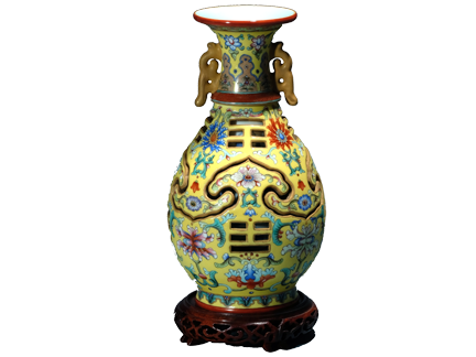 粉彩黄地镂空如意八卦旋转瓶是由鸿运斋组织景德镇高仿高手,精心复制的这款瓷瓶,其胎器制作、绘画工艺、轧道工艺,均按照乾隆时期同款的工艺水准制作,令人爱不释手。