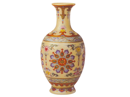 瓶敞口,细颈,溜肩,圆腹,圆足外撇。通体以米色釉为地,绘多组纹饰。腹部四组西洋式团花图案,花由八片琵琶式花瓣组成。团花间隔处绘莲花璎珞,上下均为S形线组成的勾云纹。足内书金彩“大清乾隆年制”六字篆书款。 此器纹饰明显受西洋文化艺术的影响,十分独特。