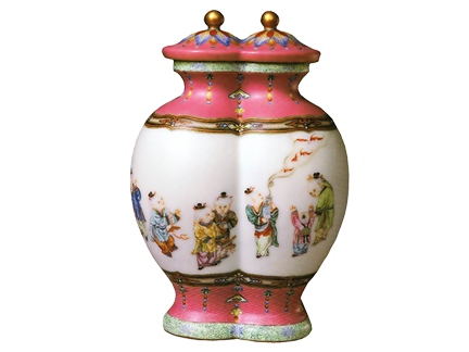 仿清乾隆珐琅彩婴戏图双连瓶,瓶体双连式,洗口,溜肩,肩以下收敛,足微外撇。附盖,盖顶施金彩。瓶里及足内施豆绿釉。瓶上下部采用扎道工艺,粉色为地,中间白地上彩绘婴孩嬉戏图。底书“大清乾隆年制”六字篆书款。 此瓶造型优美,设计精巧,绘画细腻。婴戏图童趣盎然,又有“多子多福”之吉祥寓意。