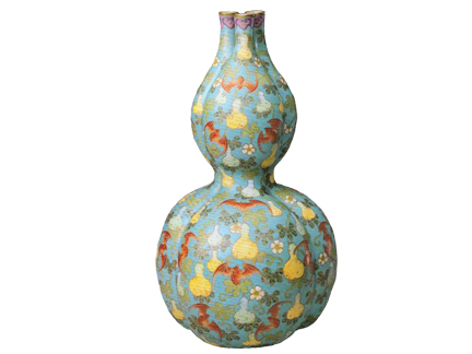 粉彩绿地描金红蝠纹三孔葫芦瓶,瓶三联葫芦式,口微撇,短颈,束腰,上椭圆,下扁圆,卧足。里施松石绿釉。外金彩口,口沿下绘一周如意云头纹。通体绿地粉彩红蝠描金葫芦纹。底足内松石绿釉书金彩“大清乾隆年制”六字篆书款。此瓶的造型与图案寓有“子孙万代”、“幸福万年”之意。