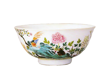 碗敞口,深弧壁,圈足。内外施白釉。外壁一侧粉彩绘雉鸡、洞石、牡丹。底书青花“大清乾隆年制”六字篆书款。