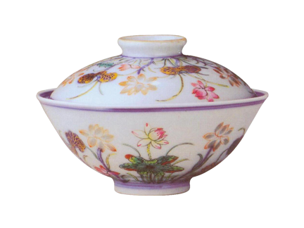 碗敞口,弧腹,圈足。盖敞口,浅弧壁,圈足式钮。内、外壁及碗盖均为白地青花粉彩加金绘莲池荷花纹。盖顶内及底均书青花“大清乾隆年制”六字篆书款。青花粉彩是清乾隆时期借鉴斗彩的装饰技法,用粉彩色料代替五彩色,形成了以青花设定轮廓,以粉彩涂染点缀装饰的新品种。