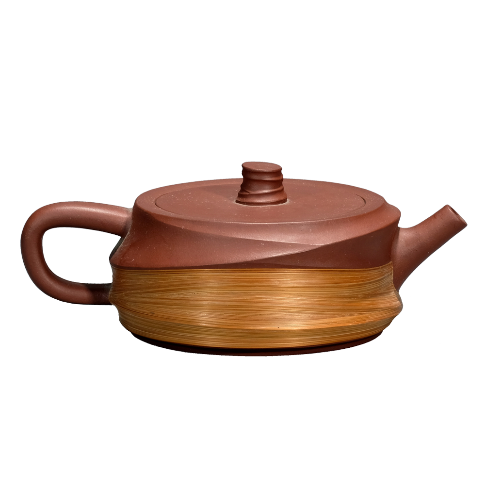 这把紫砂镶竹丝壶,其身筒尤如在春风中微拂的片片竹叶,何福礼大师用其巧夺天工的手,把竹子拉成一根根仅0.6毫米细如发丝的竹丝,染成深、淡咖啡色,然后错格镶于“竹叶”上,经20次试验,终于找到竹丝镶于壶上的柔软度,使竹丝不易折断。镶于1公分宽“叶片”上的竹丝,有22根之多,且镶得自然工整,这一手绝活可谓是奇迹。此壶高约6公分,直径11公分,用上等青紫泥精做,整把壶的视觉非常古朴浑厚,凝重典雅,而竹子镶入紫砂(正品壶的竹丝镶于三片叶子上,上下为淡咖啡色,中间为深咖啡色),更是相映生辉,妙不可言。此壶由由黄栋华创意、中国竹艺大师何福礼镶竹丝(“福礼镶竹”章盖于壶底,配红木座子)、工艺师鲍雯君制作。
