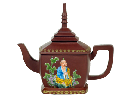 此壶,经过杨秀芬和景德镇珐琅彩绘工艺组的十余处的工艺改进,现已达到完美境界。整把壶的塔身、塔尖、塔底与嘴和把的比例十分协调,尤其是方的壶身比圆的工艺要难多倍。壶身正面的罗汉像,由于珐琅的艳丽,更彰显出宫廷艺术的高贵。而背面由江西工艺大师夏忠勇手书的佛教精美语录,从历史的角度说明在中国汉语的表达中,佛教语言的重要性,它占到了汉语表达能力的三分之二。