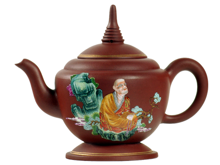 第五罗汉壶由黄栋华创意、秦永福设计,鲍雯君工艺师制壶,景德镇彩绘珐琅。
