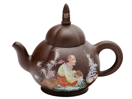 嘎纳嘎巴萨尊壶,系凌花形佛塔,由黄栋华创意,秦永福设计,杨秀芬制壶,景德镇彩绘珐琅彩。