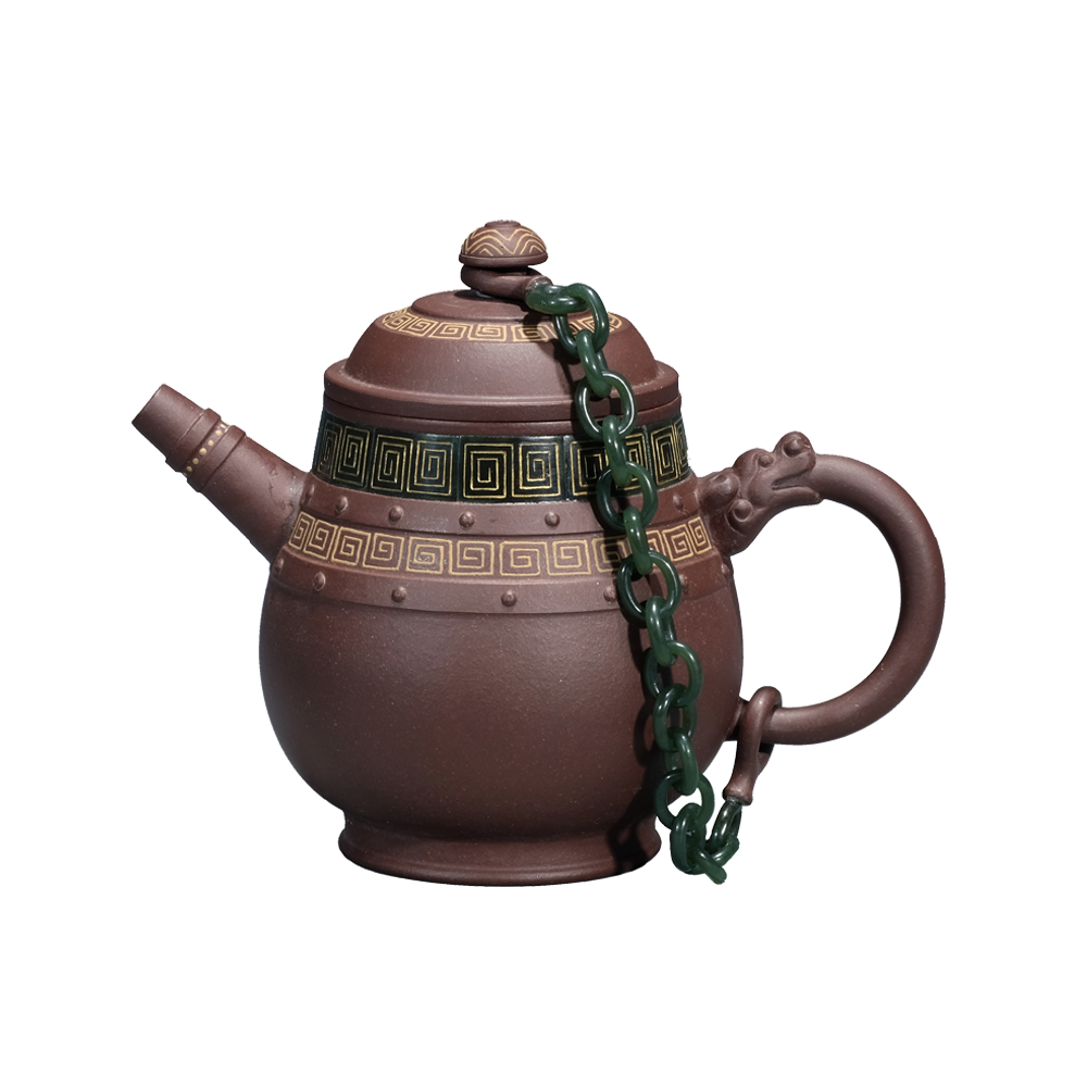 这把由故宫文博专家曹静楼创意,宜兴工艺师张子威,上海玉雕工艺大师韩荣昌联袂精制的,仿青铜夔龙玉链壶,由于用一根13公分长的玉棒,采用传统工艺雕琢成17公分长的环环相扣玉链条,镶在仿青铜器型的紫砂壶上,尤显古朴典雅、富贵大气,更张扬了中国古老玉雕工艺与紫砂壶珠联璧合的艺术之美。它弥补了紫砂壶自明至今600余年的一项技术空白。用一块整玉琢成链子,镶嵌在壶盖与把上,在18世纪欧洲皇室从中国宜兴,进口紫砂壶的珍藏品中,用金和银铸成链子的壶,至今还能见到,唯独不见玉链子壶。